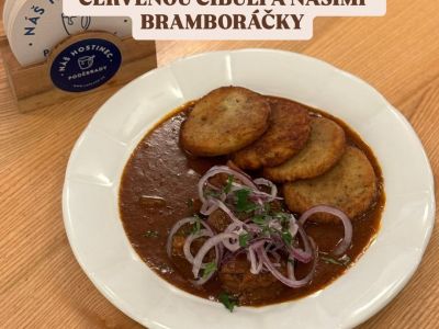3ks Plněné bramborové knedlíky uzeným masem, dušené zelí, cibulka