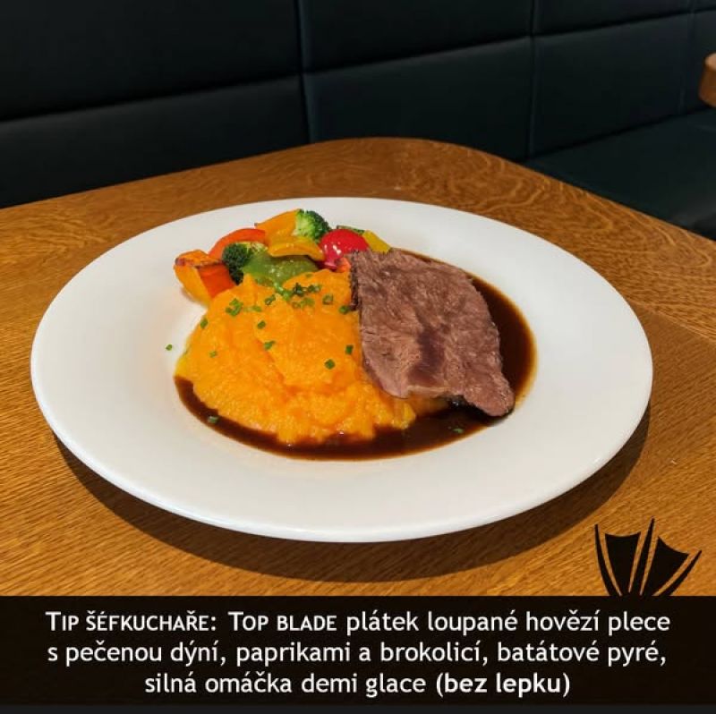 TIP ŠÉFKUCHAŘE: TOP BLADE plátky loupané hovězí plece s grilovanými paprikami, cuketou a lilkem na olivovém oleji, smažené batátové hranolky (bez lepku) 150g 79