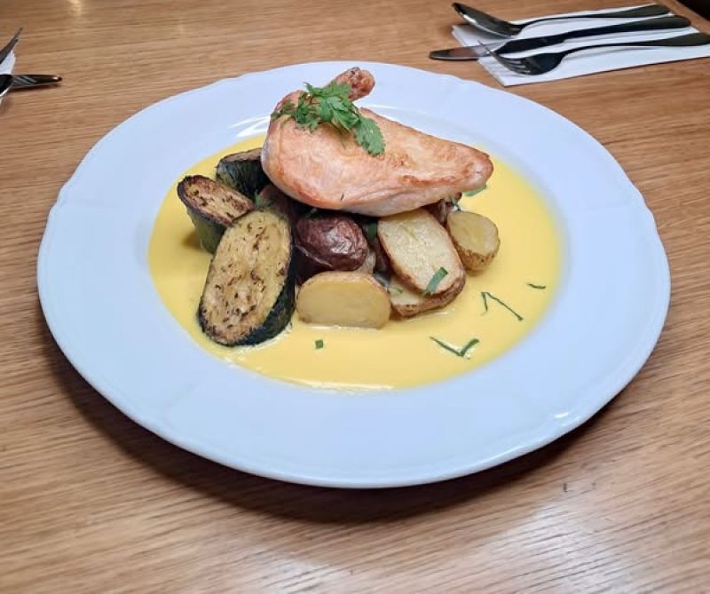 KUŘECÍ STEHNO A LA BAŽANT pečené nadivoko s vyuzeným špekem a kořenovou zeleninou, dušená rýže 150g 1910