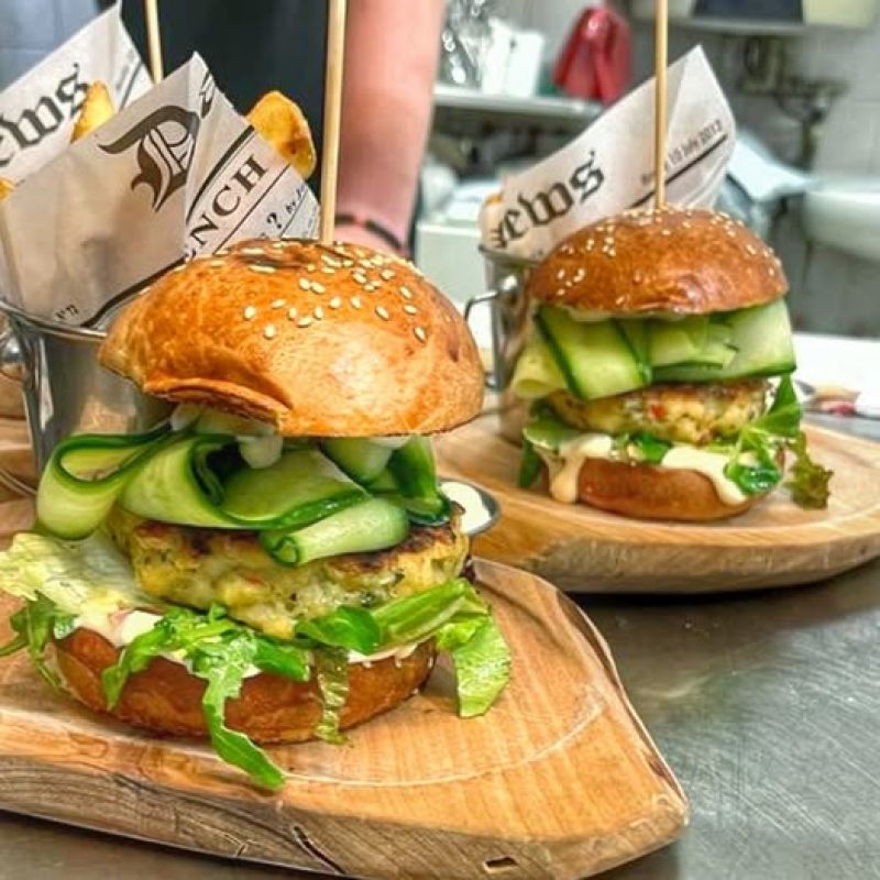 The PUB Cheeseburger - možno objednat i vegetariánskou verzi - naše sezamová bulka, 120g mletého hovězího masa, sýr čedar, slanina, majonéza, kečup, ledový salát, kyselá okurka, červená cibulka, hranolky A (1, 3, 7, 9, 10, 11) 13791011