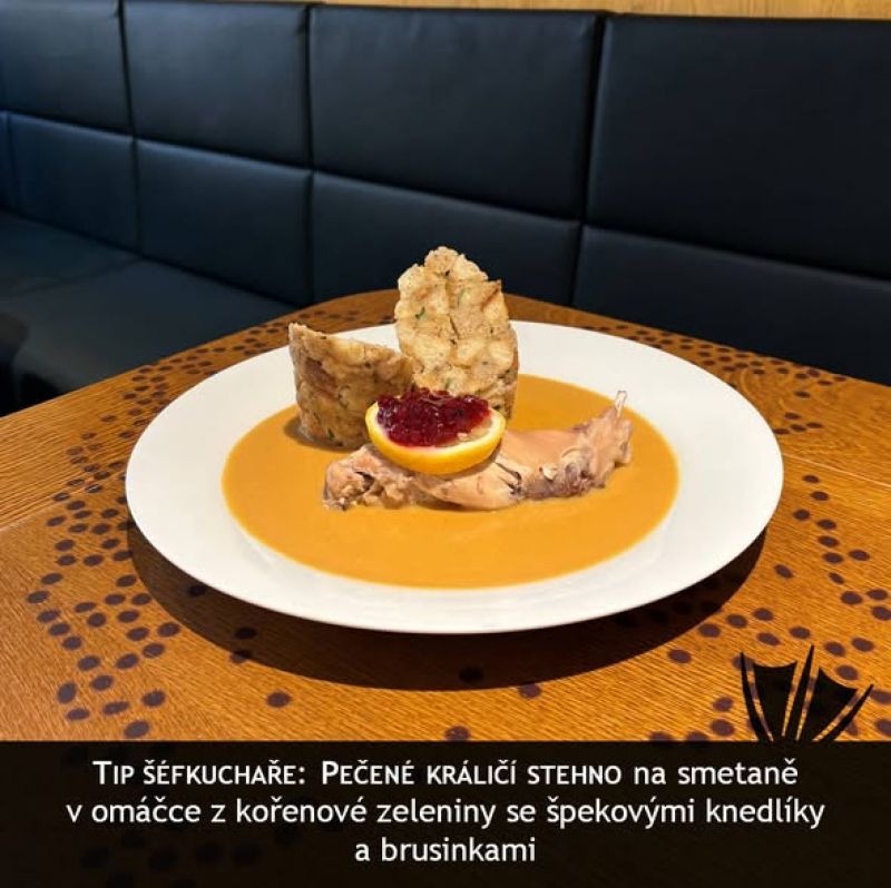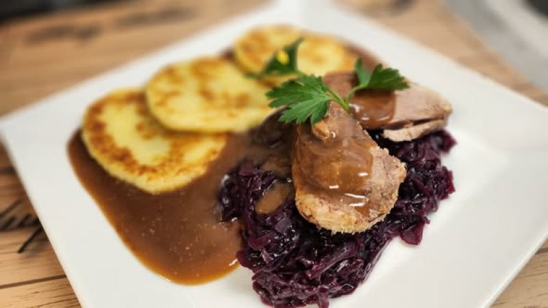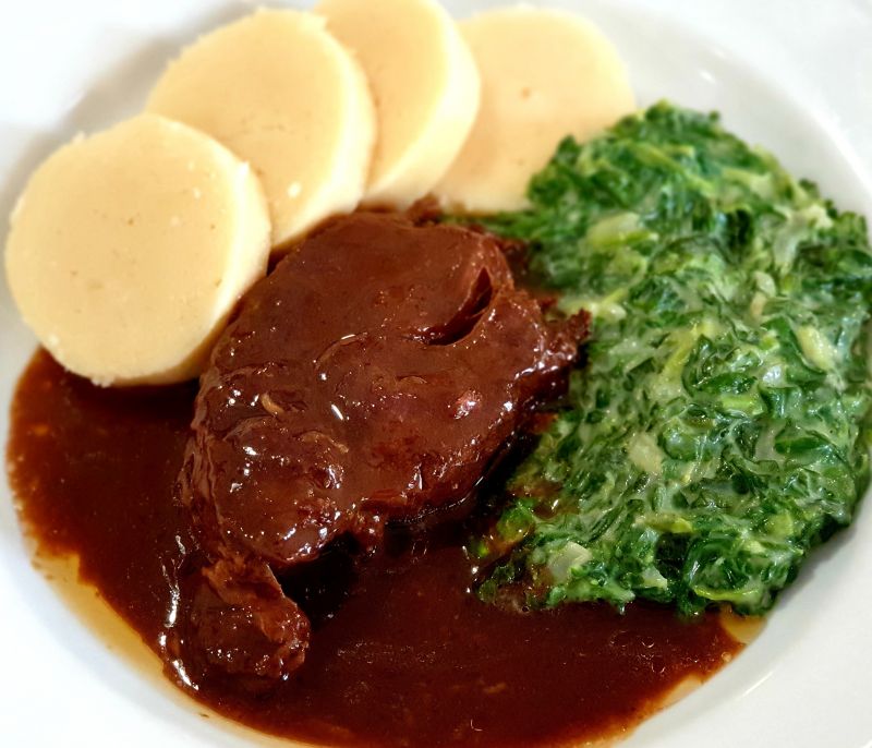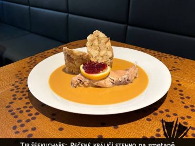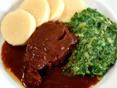 Jelení kýta na smetaně s karlovarským knedlíkem a brusinkami