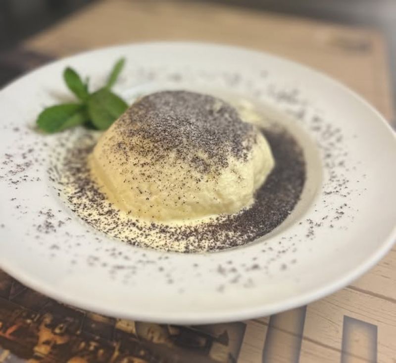 Panenka- vepřová panenka grilovaná do růžova, balená v anglické slanině, podávaná s pečenými bylinkovými brambory a pepřovou omáčkou /1,7/
