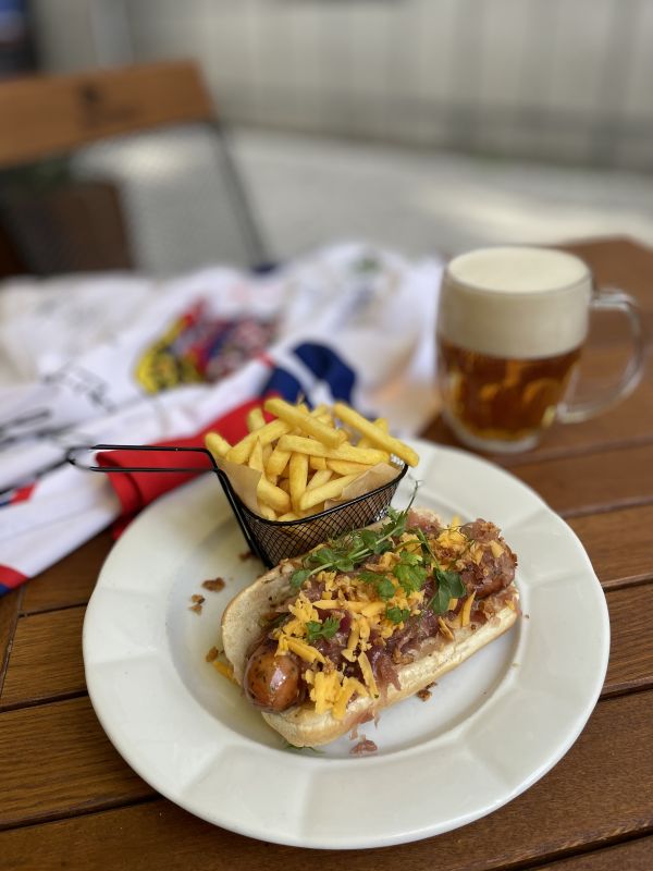 STREETOVKA: hot dog s bílou bylinkovou klobásou, kari majonázou, kečupem, nakládanou a křupavou cibulkou a domácími hranolkami