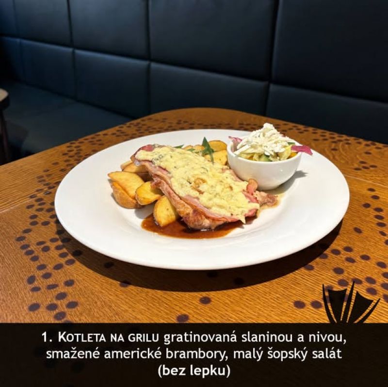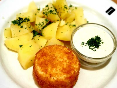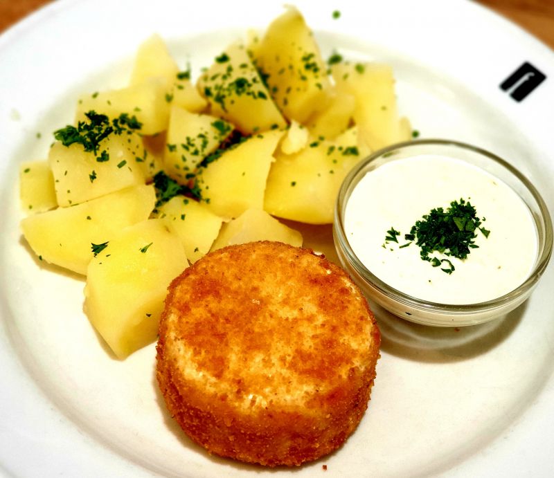 Smažený hermelín, pažitkové brambory, tatarská omáčka A:1, 3, 7, 10