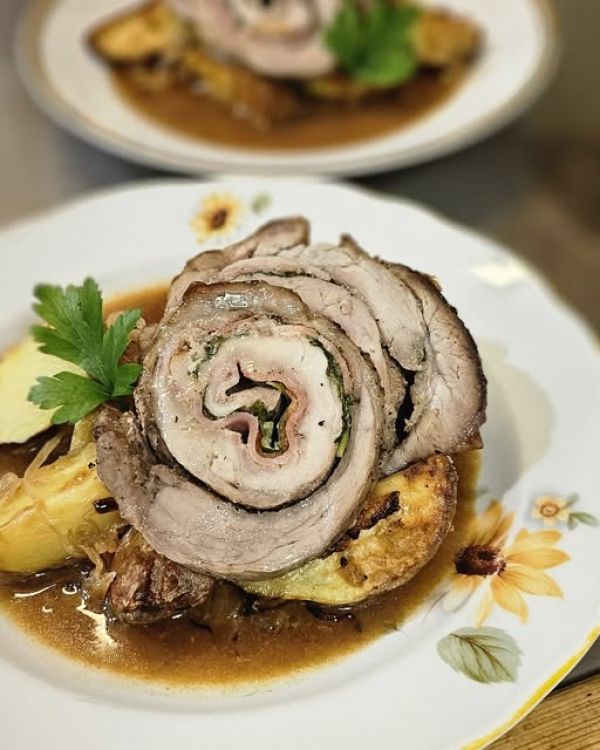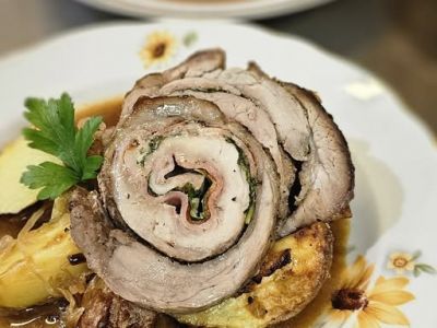 170g Kuřecí roláda plněná mletým masem, slaninou a mandlemi se špenátem a kulatým žemlovým knedlíkem