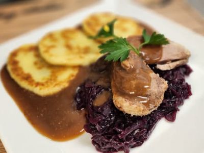 400g. s. k. Pomalu pečené stehýnko z husokachny, červené zelí, bramborový a houskový knedlík