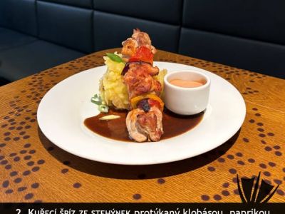 Smažené kuřecí prso plněné camembertem a čabajkou, bramborová kaše
