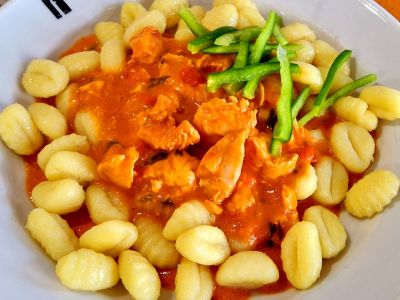 Naše vaječné fusilli s lososem, smetanou a rozmarýneM