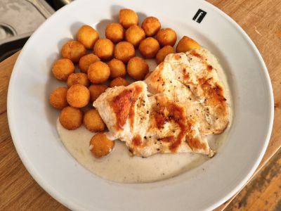 vykostěné kuřecí stehno v estragonovo-hořčičné omáčce, bramborová kaše
