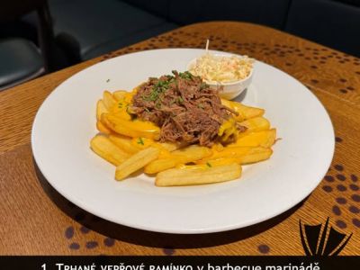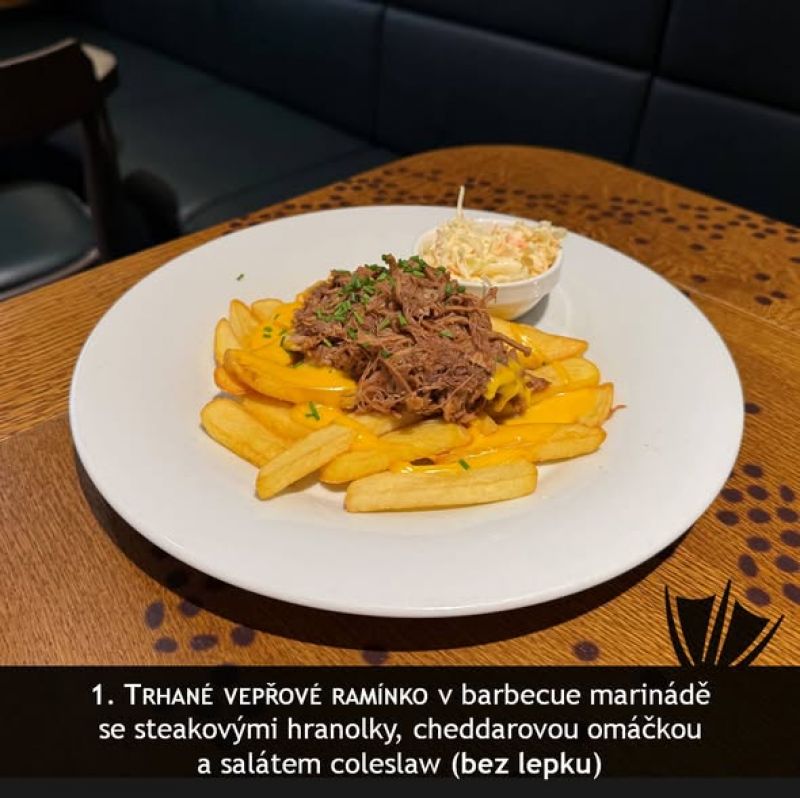 Trhané vepřové s čedarovou omáčkou, hranolky
