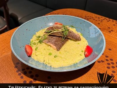 Filet z lososa, šafránová tarhoňa, mladý špenát, vinná omáčka 330 Kč