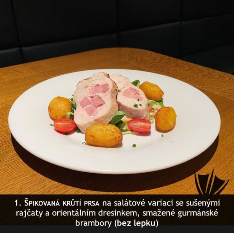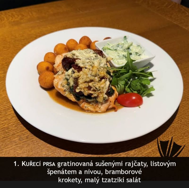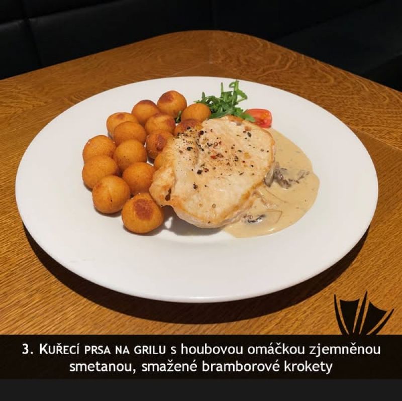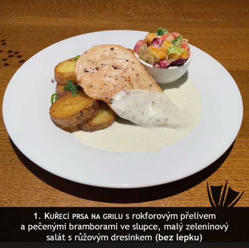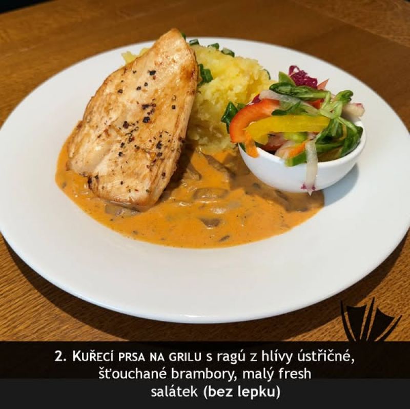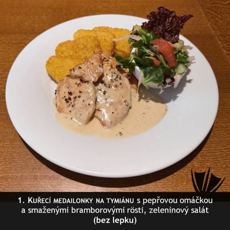 140g kuřecí medailonky s bylinkovou omáčkou, šťouchaný brambor (1,7,9)