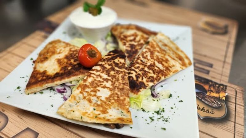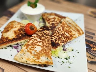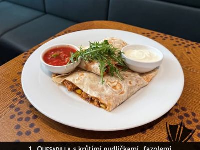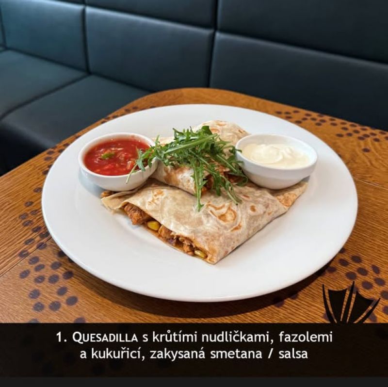 QUESAVEGGIE DE MAÍZ ři zapečené kukuřičné tortilly se sýrem Gouda, bramborami a špenátem. Ozdobené zakysanou smetanou, salátem, balkánským sýrem a nakládanou červenou cibulkou. Podáváme s rýží, černými fazolemi a omáčkou