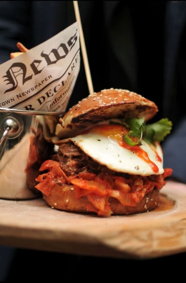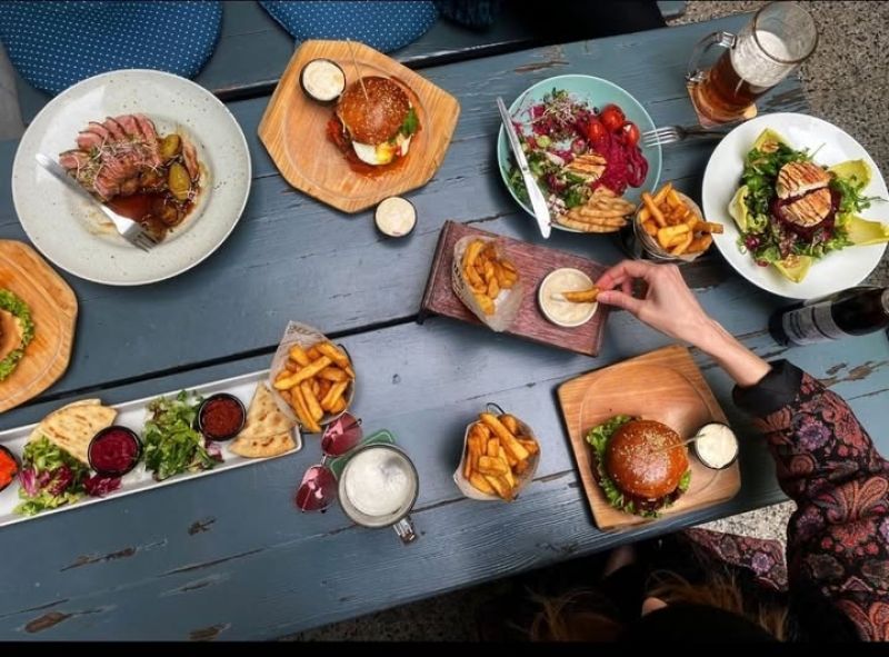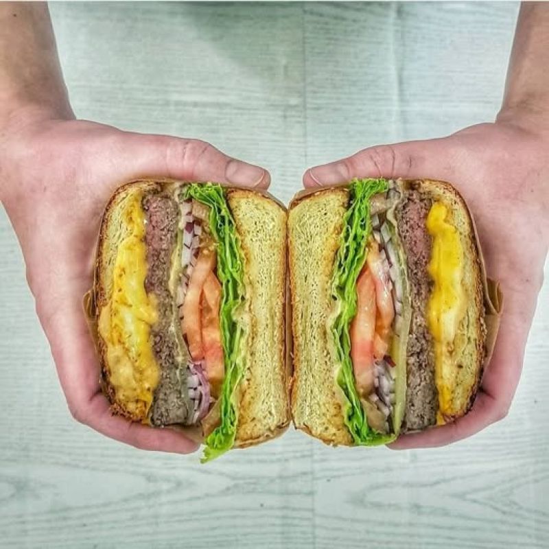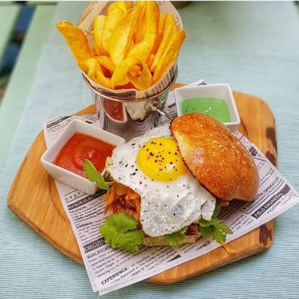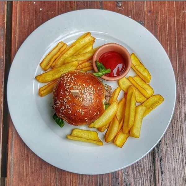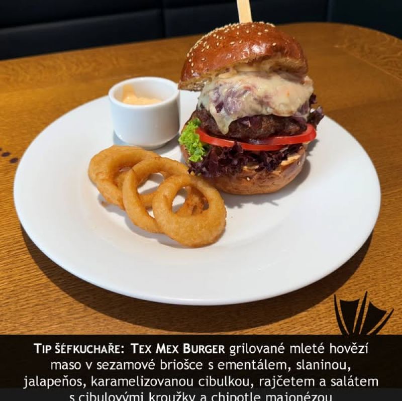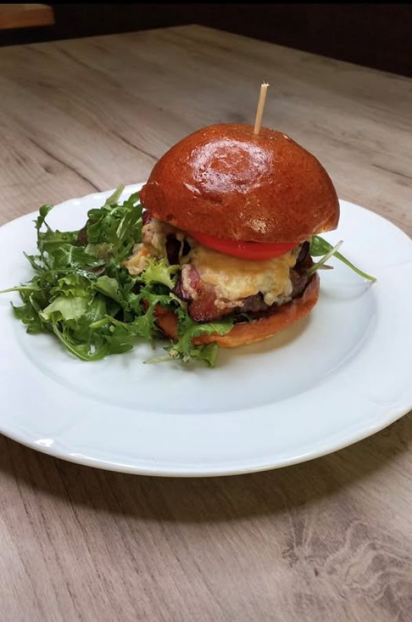 The PUB Cheeseburger - možno objednat i vegetariánskou verzi - naše sezamová bulka, 120g mletého hovězího masa, sýr čedar, slanina, majonéza, kečup, ledový salát, kyselá okurka, červená cibulka, hranolky A (1, 3, 7, 9, 10, 11) 13791011