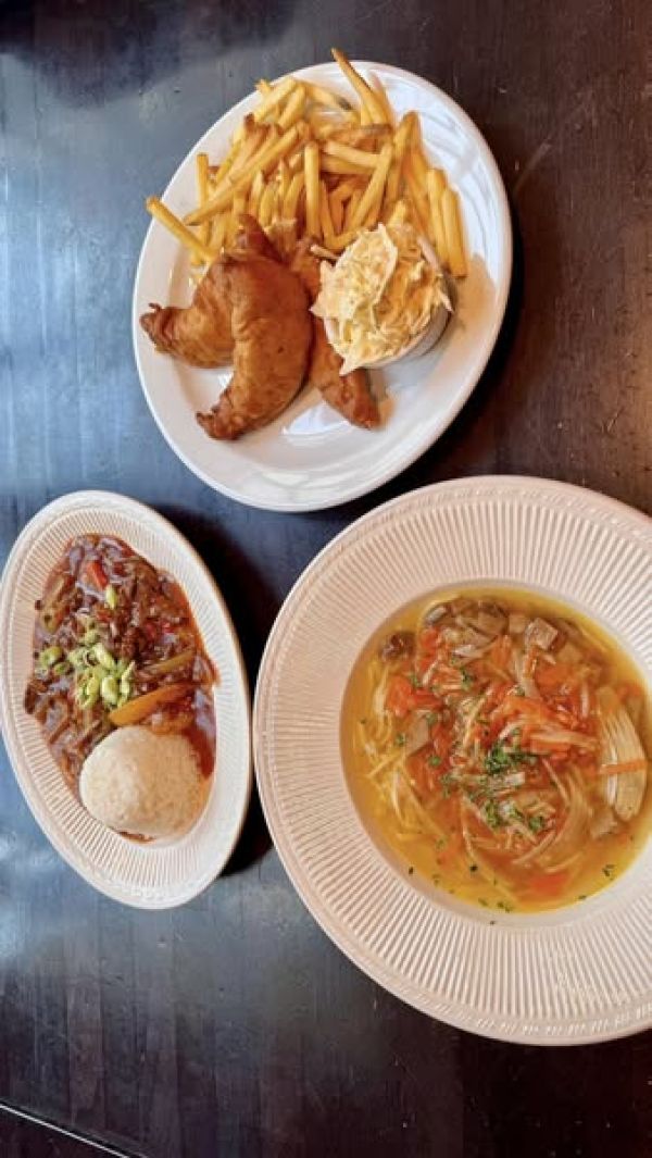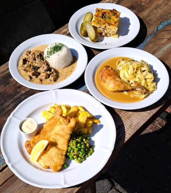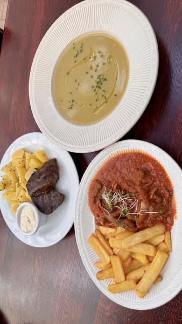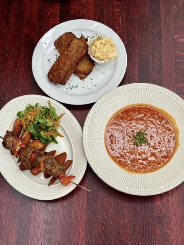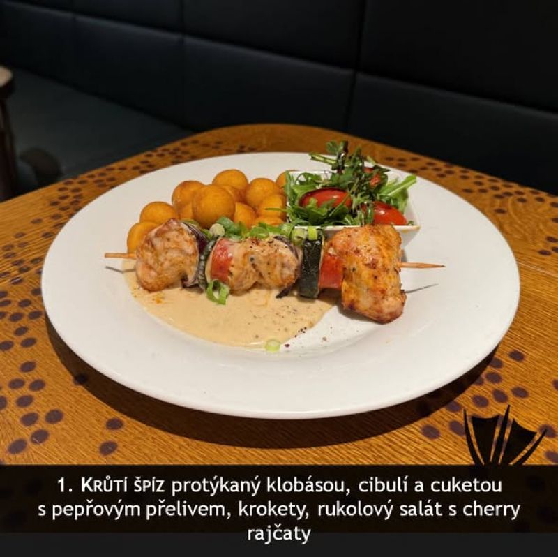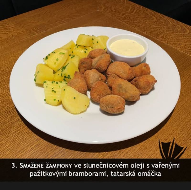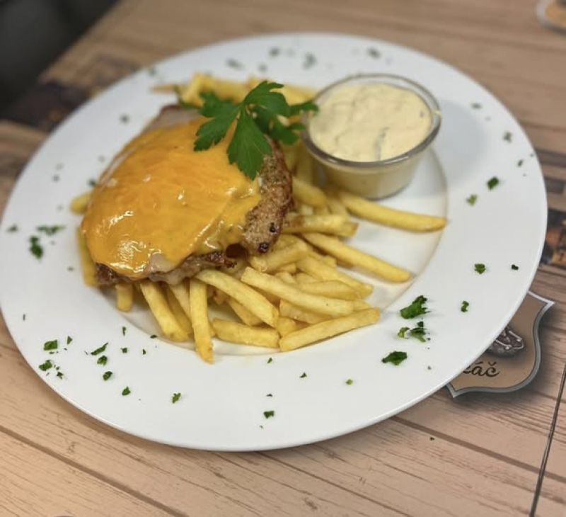 0,25l slepičí vývar s masem, zeleninou a strouháním (1,3,9) a 130g sýrový špíz (gouda, eidam, niva), hranolky, tatarská omáčka (1,3,7)