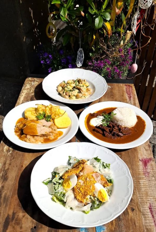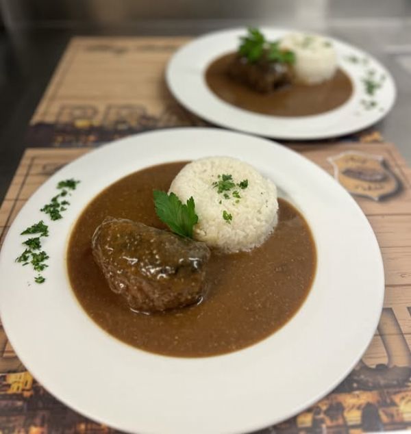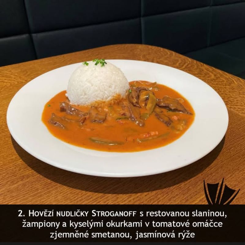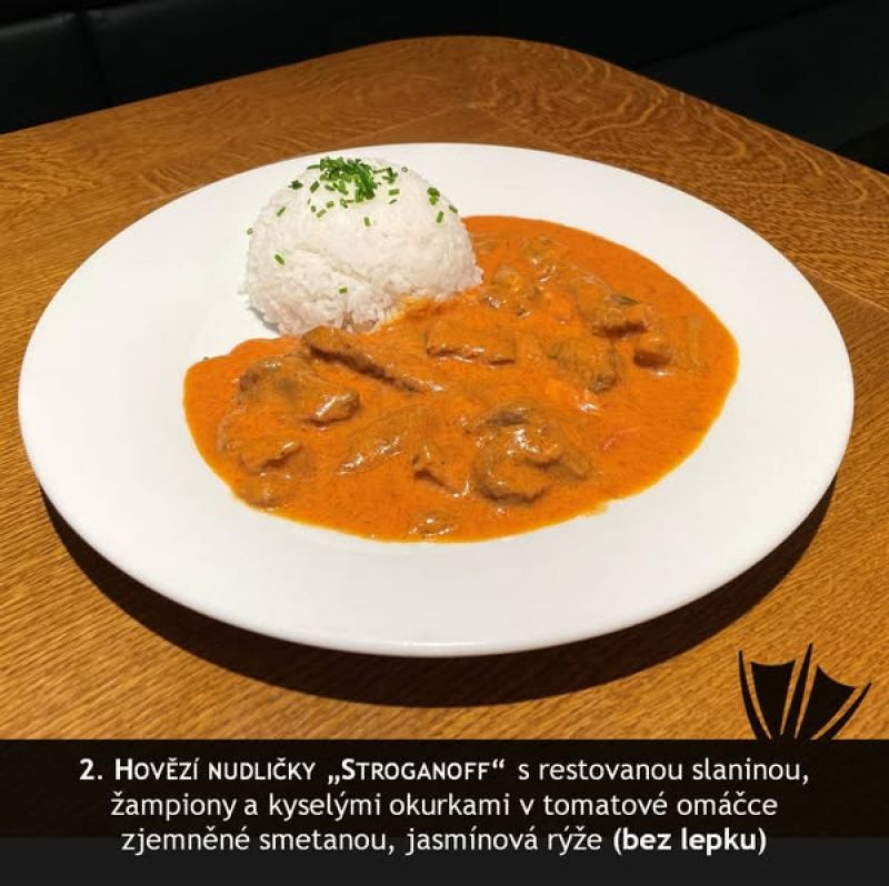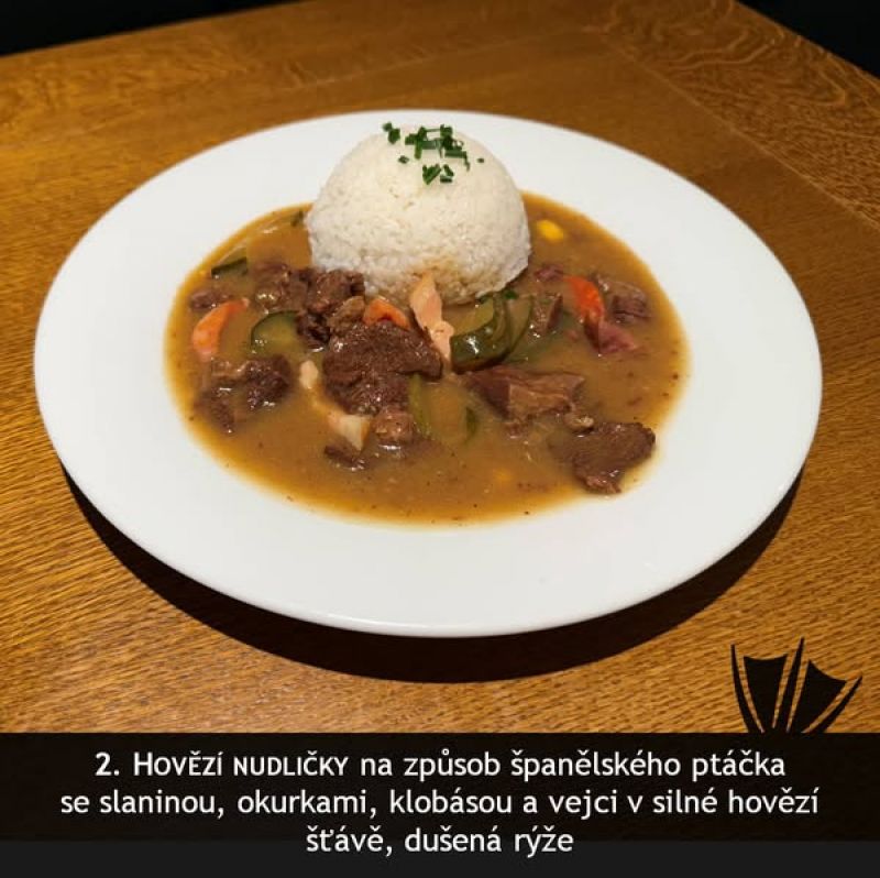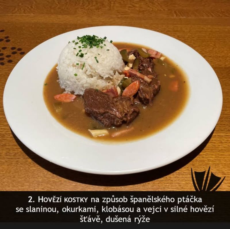 Hovězí ragú se slaninou, vejcem, okurkou, párkem - Rozlítaný ptáček, jasmínová rýže nebo houskové knedlíky A (1, 3, 5, 7) 1357