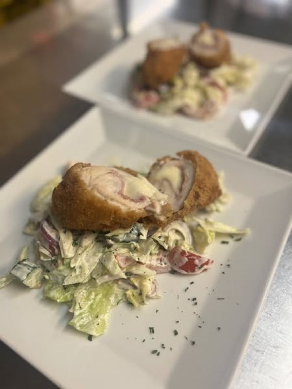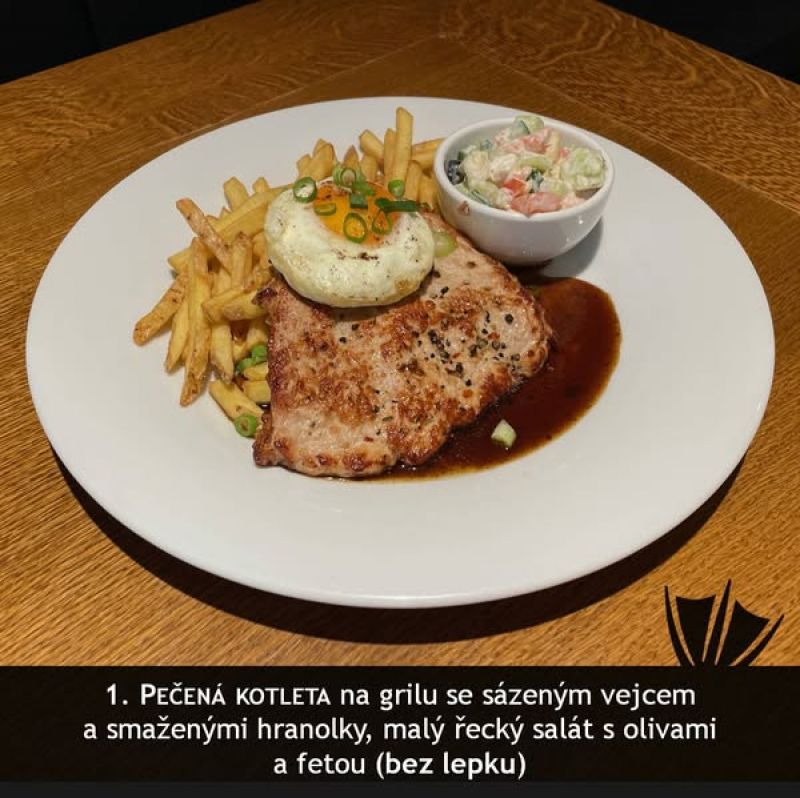 Řízek Ondráš-medajlonky z vykoštěné vepřové kotlety smažené v bramborakovém těstě s česnekem a majoránkou, podávané se zelným salátem/1,3/