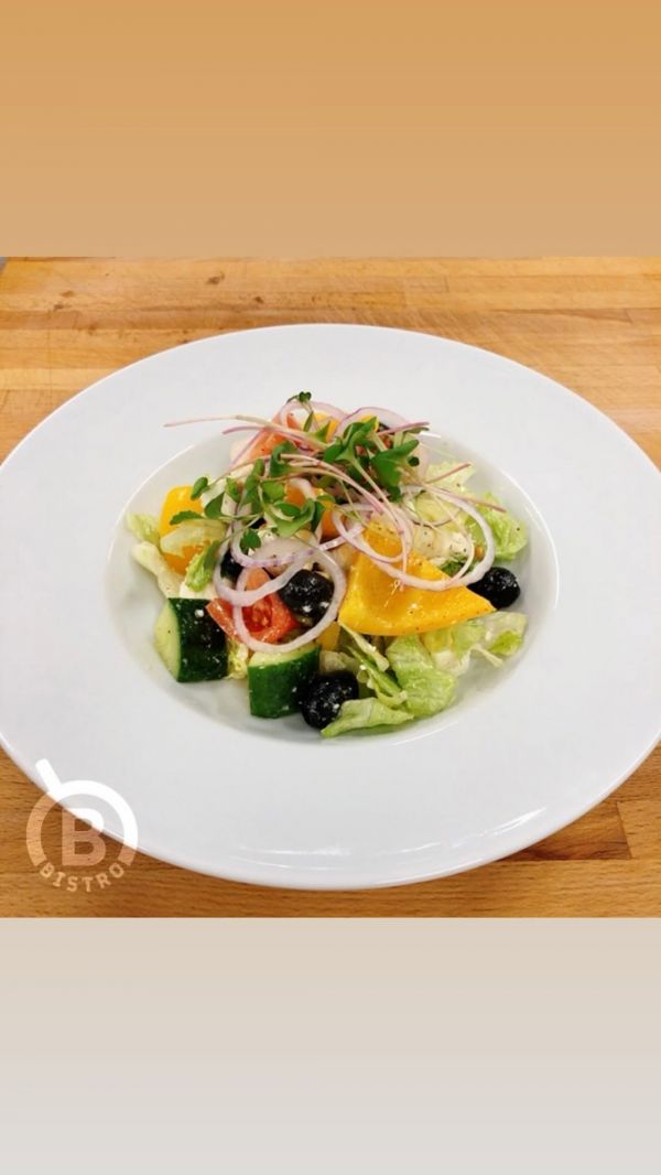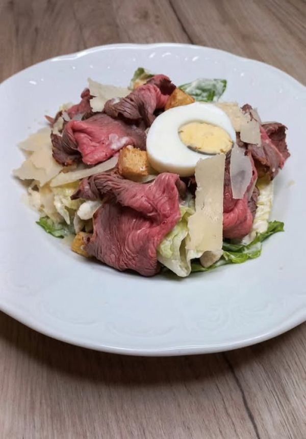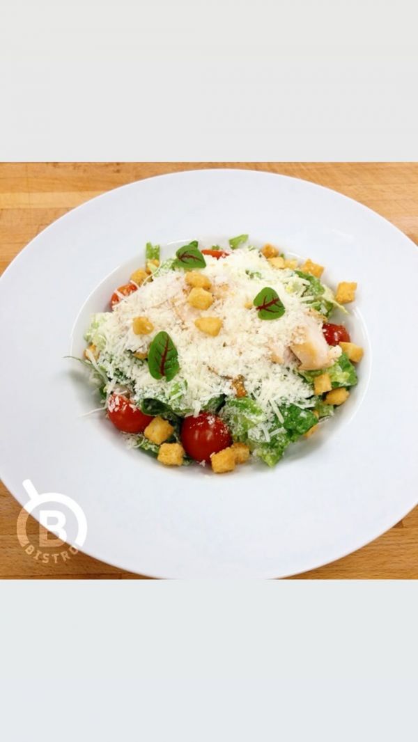 Velký zeleninový salát *Caesar*s kuřecím masem, sherry rajčátky, drezinkem, parmazánem, slaninkou a krutóny 713