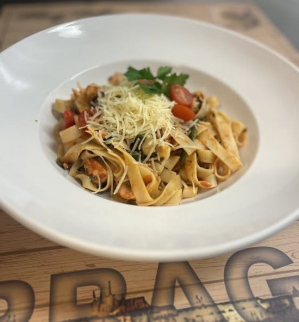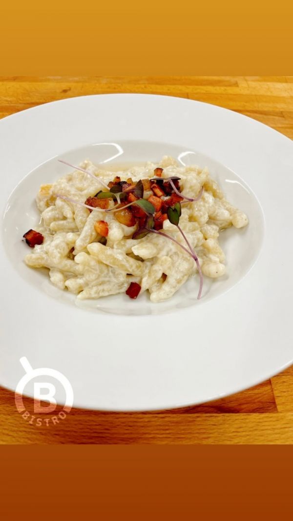 350g bramborové gnocchi s kuřecím masem a sýrovou omáčkou, rukola a parmezán (1,3,7)