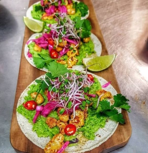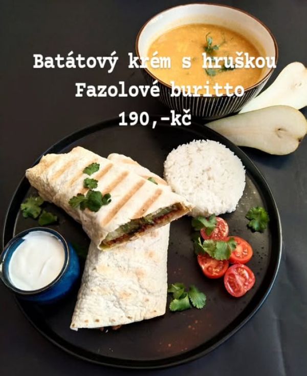 Quesadilla s nekuřecími kousky s bramborami a fazolovou pastou, guacamole 16
