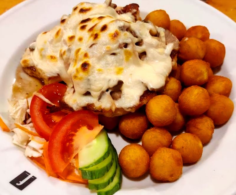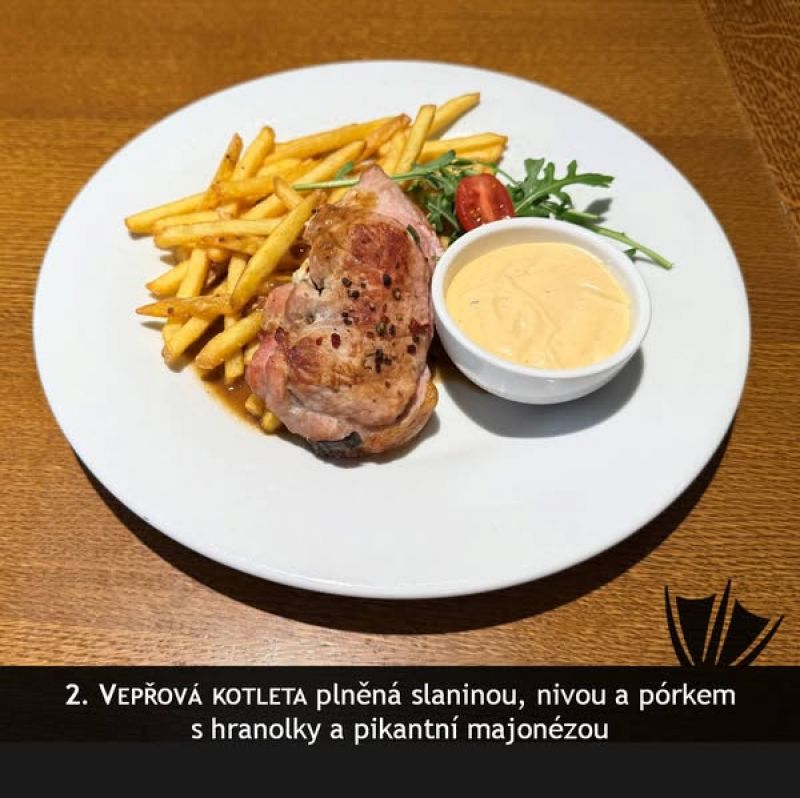 Medailonky z v. panenky zapečené hermelínem, ve šestkové omáčce, hranolky 713