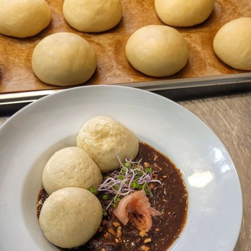 Pomalu pečená vepřová krkovička s kysaným zelím, restovanou cibulkou a domácím houskovým knedlíkem 137