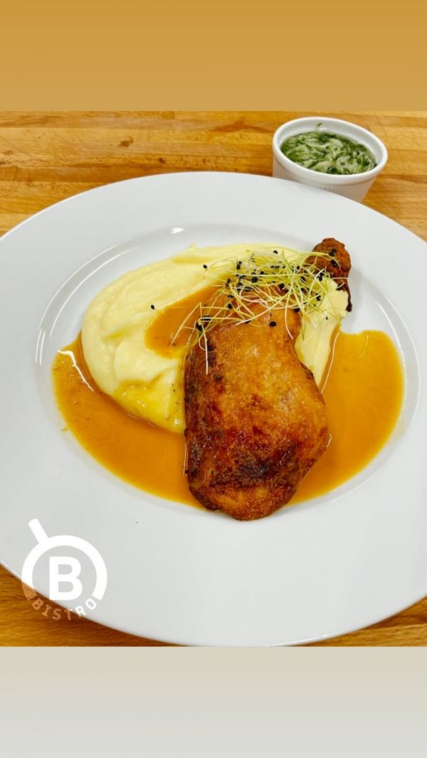 300g. s. k. Pečené kuřecí stehýnko, bramborová kaše