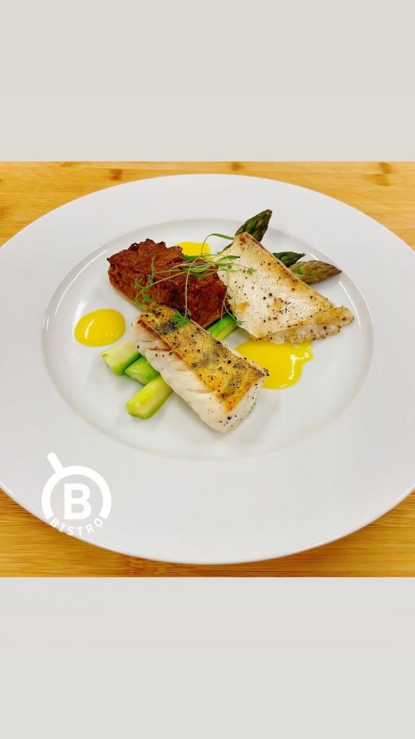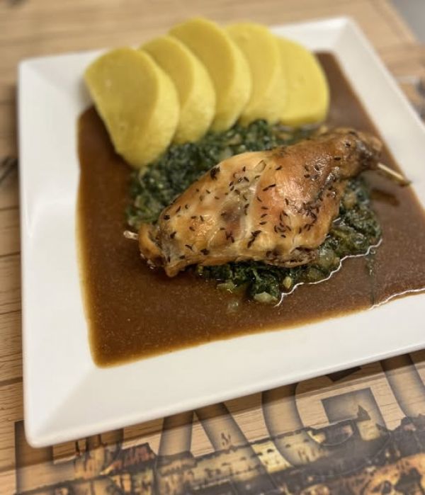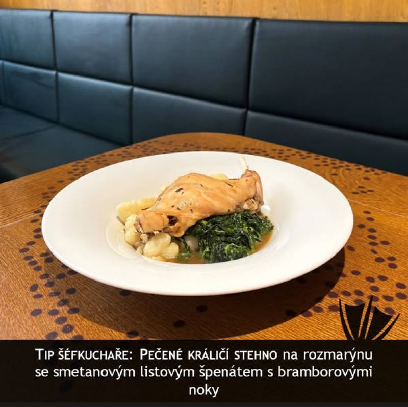 Králík Braillon -pomalu pečené kralíčí stehno s dijonskou hořčicí, suchým bílým vínem, kořenovou zeleninou, tymiánem a smetanou, podávané s domácím šunkovým a houskovým knedlíkem/1,3,7/