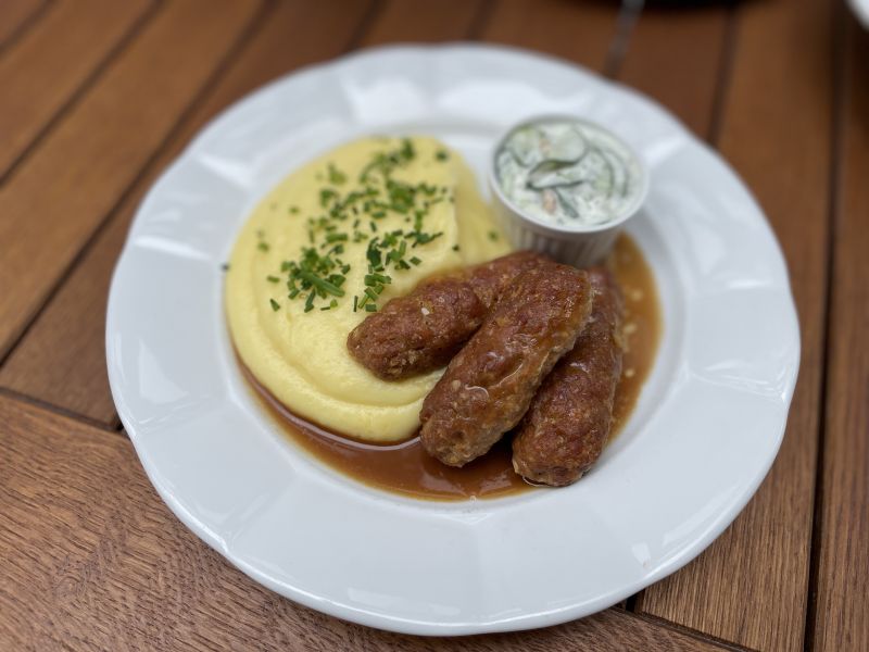 Opečená vinná klobása s jemnou bramborovou kaší a domácí pikantní zeleninou 13791012