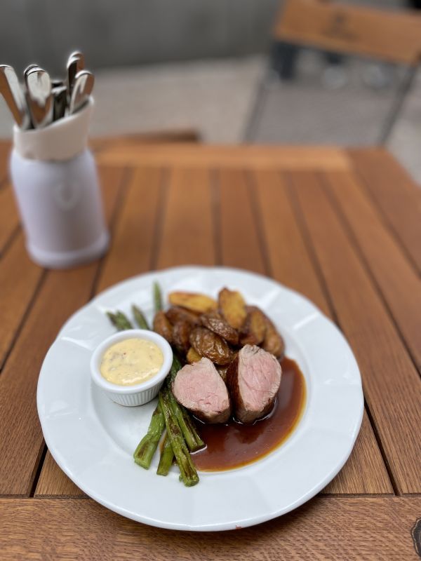 Anglický roastbeef, grenaille se slaninou a cibulkou, dijonská majonéza