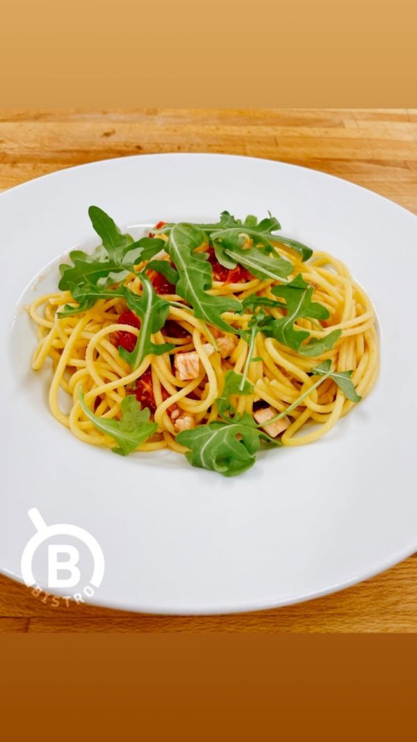 Spaghetti aglio olio s kuřecími prsy a parmazánem, rukola A (1, 3, 7) 137