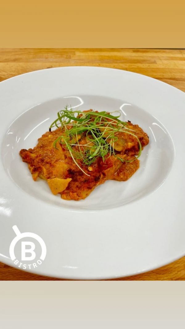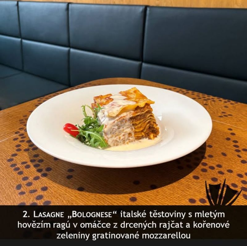Lasagne alla Bolognese- italské těstoviny prokládané mletým hovězím masem v rajčatové omáčce s česnekem, bazalkou, červeným vínem, kořenovou zeleninou, bešamelovou omáčkou, parmezánem a sýrem mozzarella, podávané s rukolovým salát