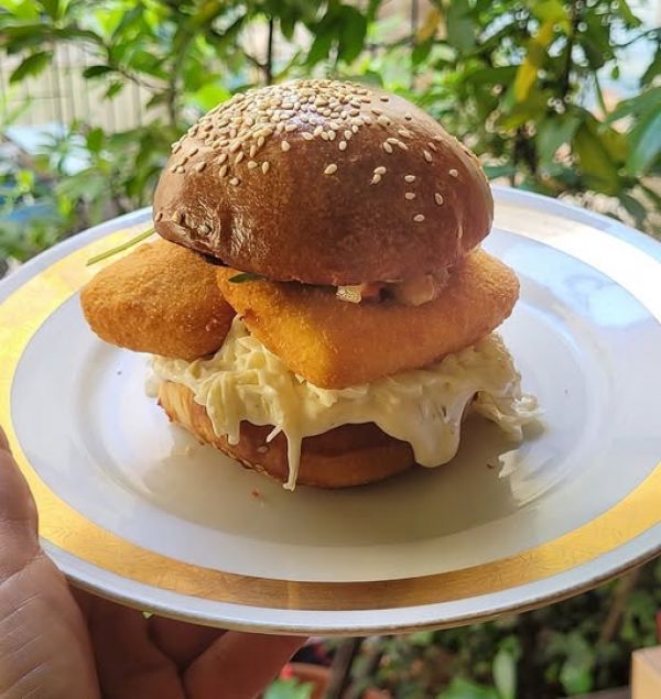 Smažák burger- smažený sýr v rozpečené máslové bulce s tatarskou omáčkou, trhaným salátkem, plátky kyselé okurky a rajčat, podávané s hranolky/1,3,7/