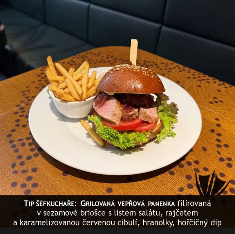 Biftečky z mletého masa balené v pancettě, omáčka ze zeleného pepře, bramborové hranolky A:1, 3, 7