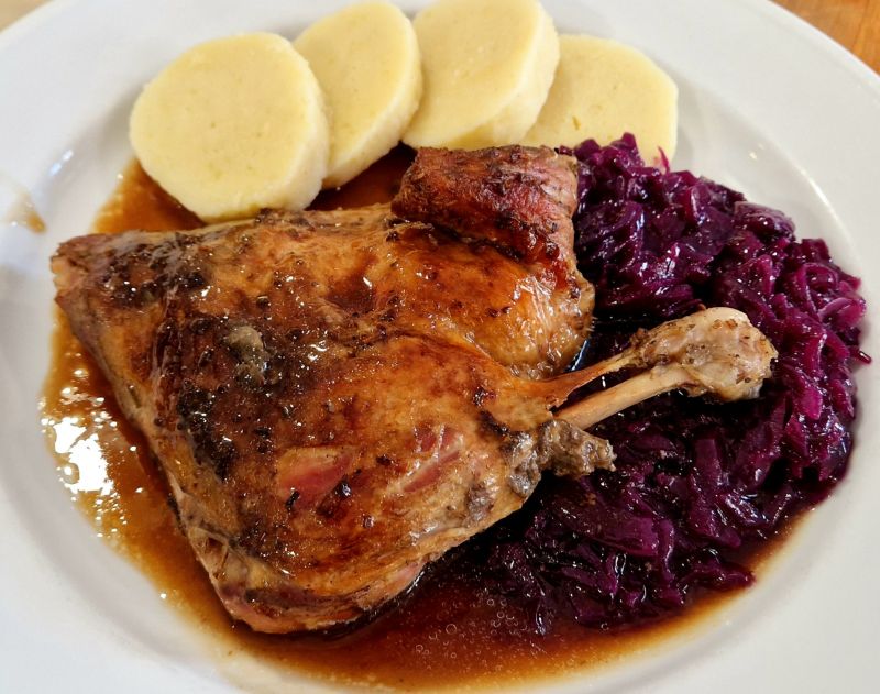 KONFITOVANÁ KACHNA ¼ s červeným zelím a bramborovým knedlíkem s cibulkou