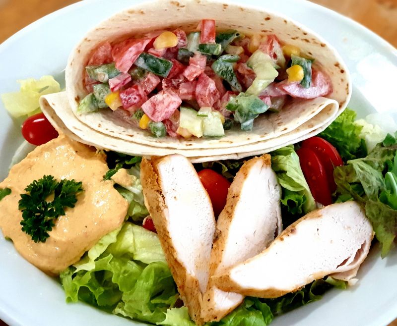 Wrap s kuřecím masem, avokádem a zeleninou, tomatová salsa, bramborové hranolky A:1, 3, 7