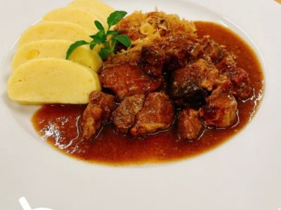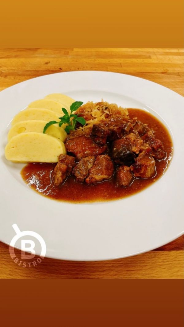 200g NEJVÍCE ŽÁDANÉ - Pomalu tažený guláš z hovězí kýty, karlovarské knedlíky (1,3,7,9)