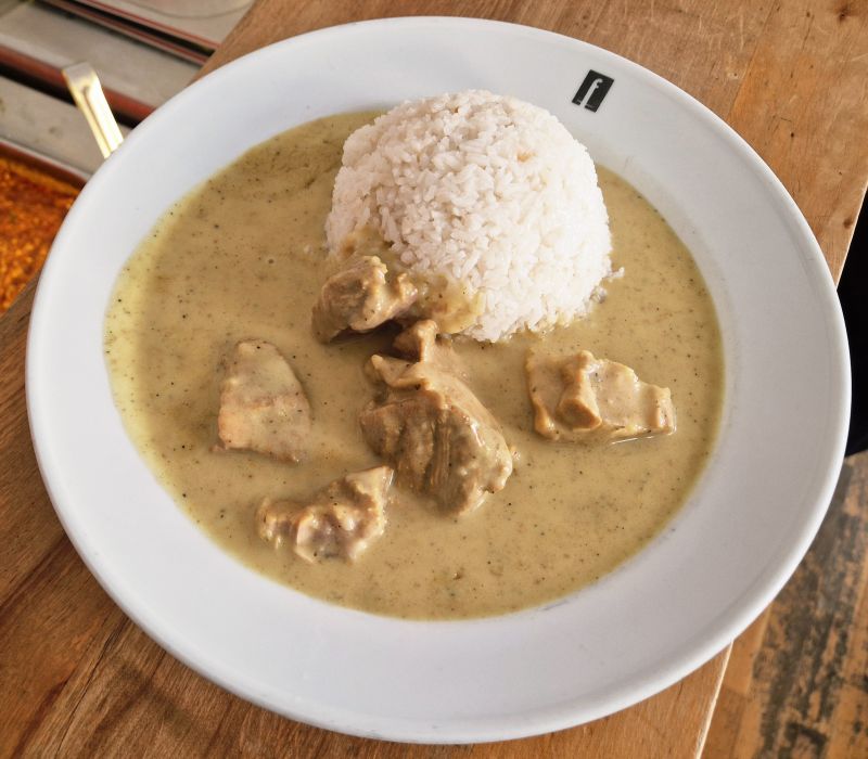 Madrás Menu (kuřecí/zeleninový) - Kousky kuřete nebo zeleniny vařené v jemně pálivé omáčce, podávané s rýží a salátem.
