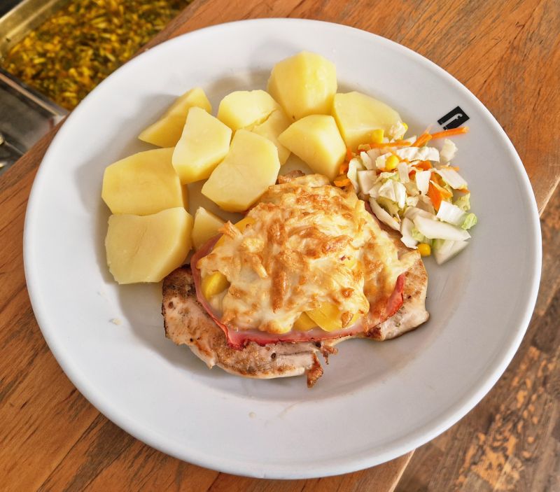 150g Kuřecí steak zapečený se šunkou a sýrem, hranolky