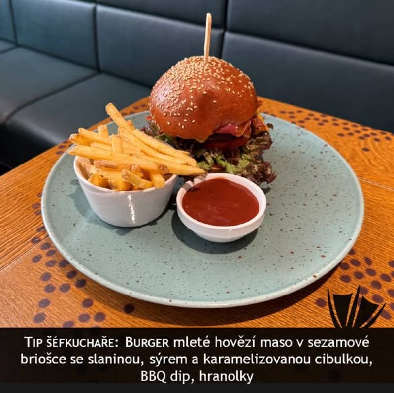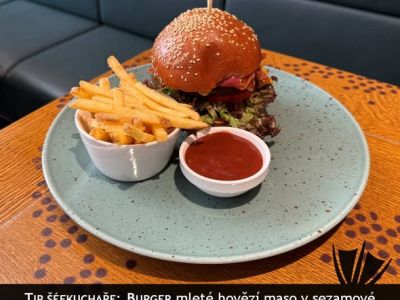 Beef Burger 150g hovězí burger z plemene angus s cibulovou marmeladou, česnekovou majonézou, slaninou, čedarem, ledovým salátem, bramborové hranolky s čedarem, zelný salátek (1,3,6,7,9,10,12)