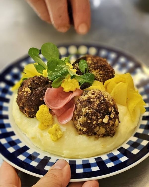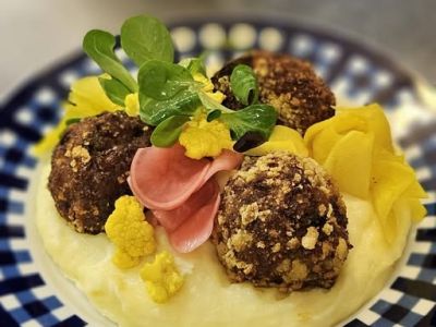Tyrolské telecí 150g pomalu dušená telecí plec na šalotce, česneku a rozmarýnu, servírovaná na jemné bramborové kaši, přelitá silnou omáčkou a doplněná křupavým slaninovým chipsem (1,7,9,10,12)