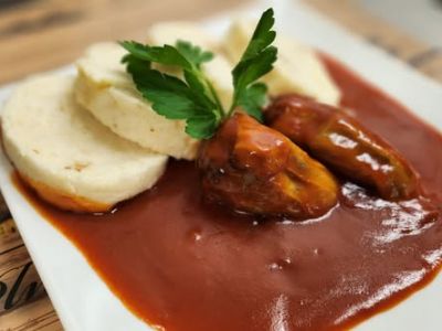Plněný paprikový lusk v rajské omáčce podávaný s domácím houskovým knedlíkem, nebo s rýží 1379