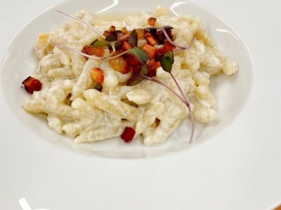 Selečí porcchetta, růžičková kapusta se slaninou, špecle, tymiánové glasé 325, -