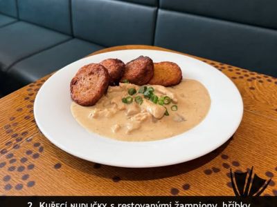 Liptovské halušky 300g bramborové halušky s krémovou bryndzou, doplněné restovanými žampiony nebo křupavou slaninou (1,3,7)