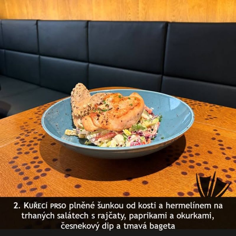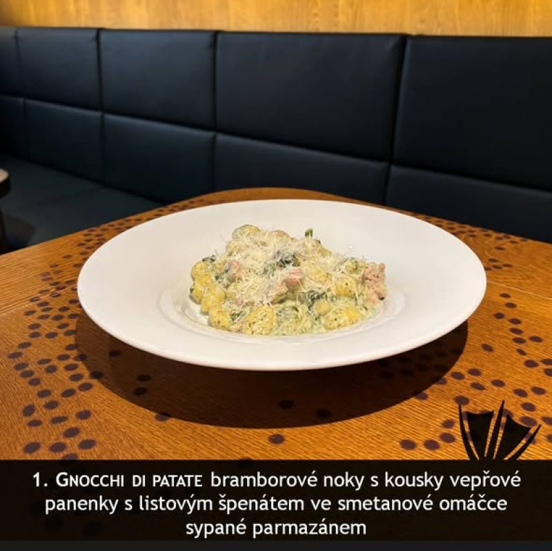 Minestra di piselli con ricotta - Jemný krém z čerstvého hrášku zjemněný ricotou a smetanou, podávaný s naším chlebem z pece, Involtino di pollo con spinaci e gorgonzola Pečený závitek z kuřecích prsou plněný listovým špenátem, sý