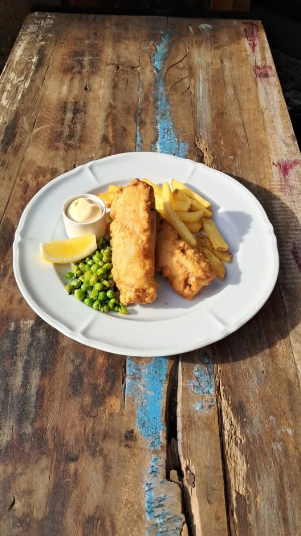 FISH & CHIPS - filet tresky v pivním těstíčku, mačkaný hrášek na másle, hranolky, citrónová majonéza