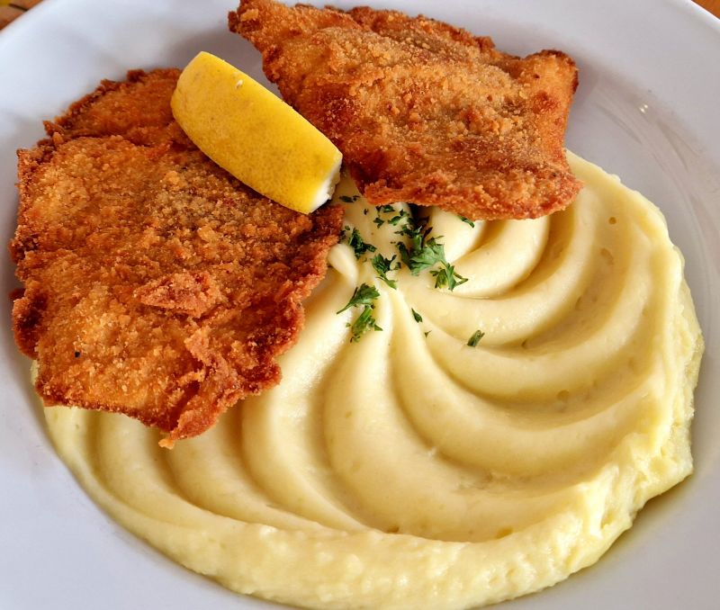 180g Smažené kuřecí nugety na savojský způsob, bramborová kaše, marinované kukuřice (1,3,7,9,12)