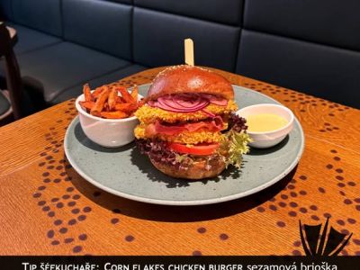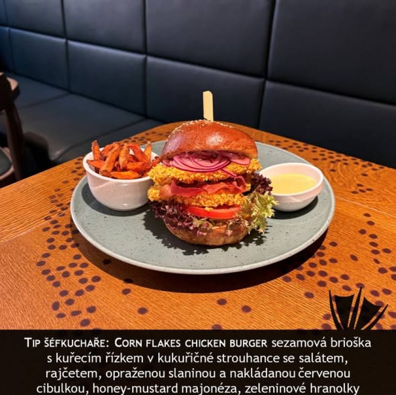 The PUB Farmářský Burger - možno objednat i vegetariánskou verzi - naše sezamová bulka, 120g vyzrálého hovězího masa, česneková majonéza, slanina, sázené vejce, cheddar, ledový salát, rajče, hranolky A (1, 3, 7, 9, 10, 11) 13791011