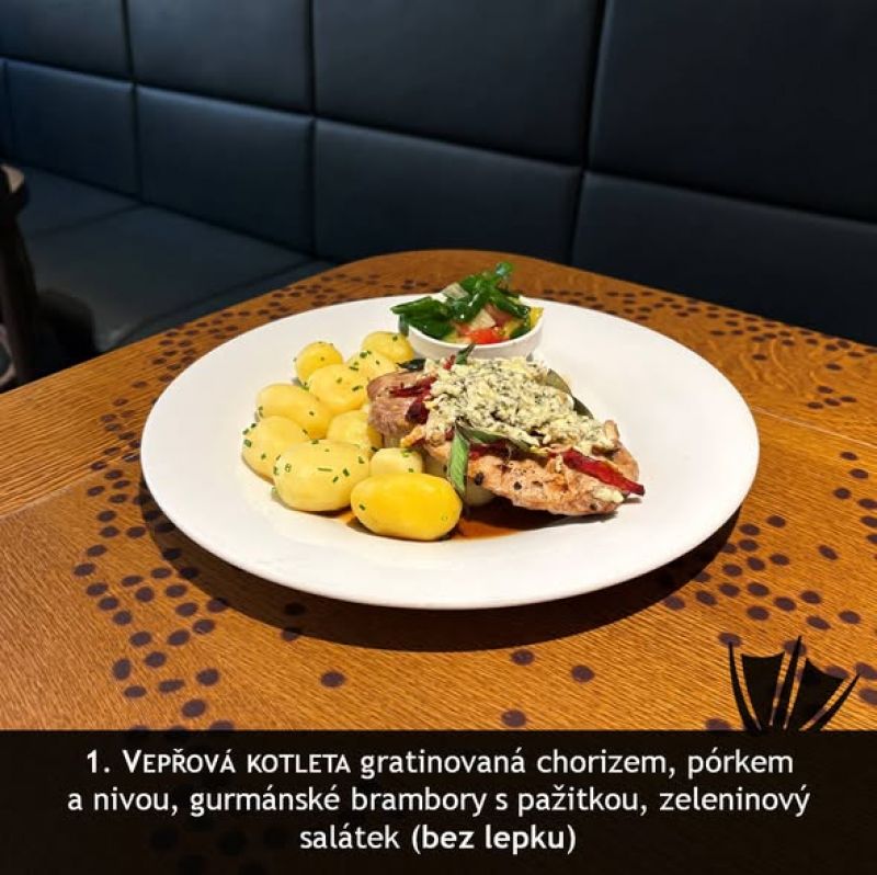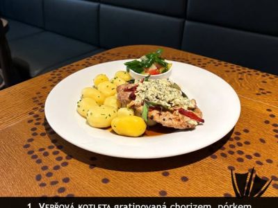 150g Zapečený vepřový steak (šunka, sýr), hranolky, naše tatarka, salátek A (1, 3, 5, 7) 1357