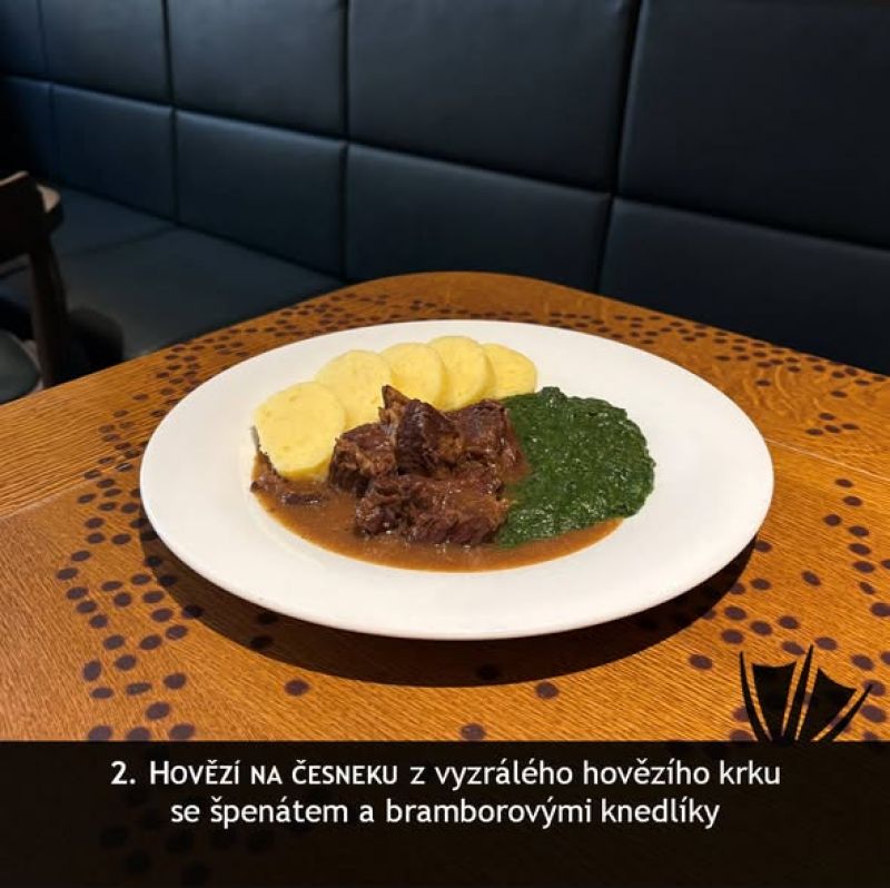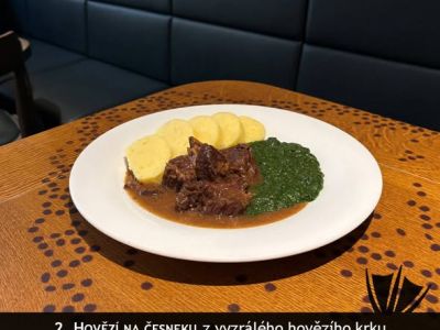 Královský hovězí guláš, houskový knedlík, opečená feferonka 195 Kč